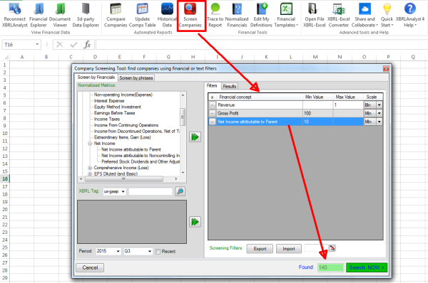 Here are a few examples:• Look for all companies that reported in 2015-Q2: Revenue<$1B, Gross Profit>$100M and Net Income > $10M. There are 140 companies • Look for companies that had more than $1B warranty payments in 2014-FY. There are 78 companies • Look for companies that reported in 2014-FY filing US-GAAP concept ‘OperatingLeasesFutureMinimumPaymentsDue’ with value > $1B. There are 253 companies. In just a few clicks or using drag&drop, you can build a sophisticated set of screening conditions in Excel that would filter information from financial statements and disclosures. Every screener can be saved in Excel and re-used later on. The results are also exportable in Excel and are easy to track in original financial reports using XBRLAnalyst’s Trace To Report functionality. |