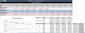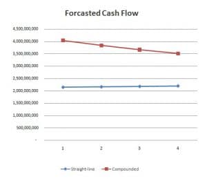 By using this historical cash flow trend, we will then build our forecasted cash flows, using both straight-line and compounded methods. As you would notice below, the two methods have opposite results: